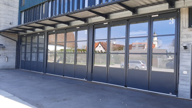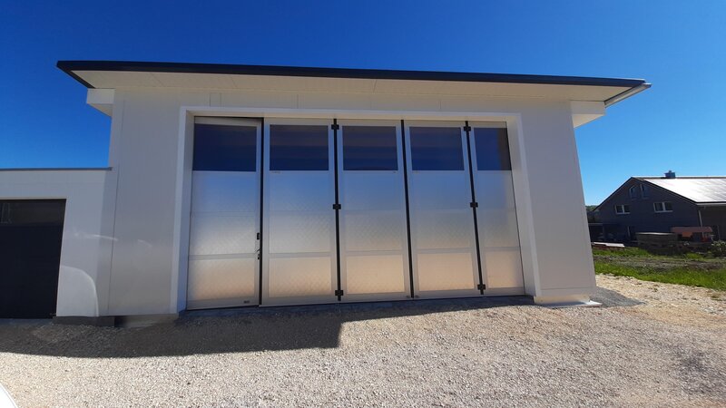 Dabei sind natürlich auch verschiedenste Antriebs- und Steuerungsmöglichkeiten jederzeit mit dem Falttor kombinierbar.